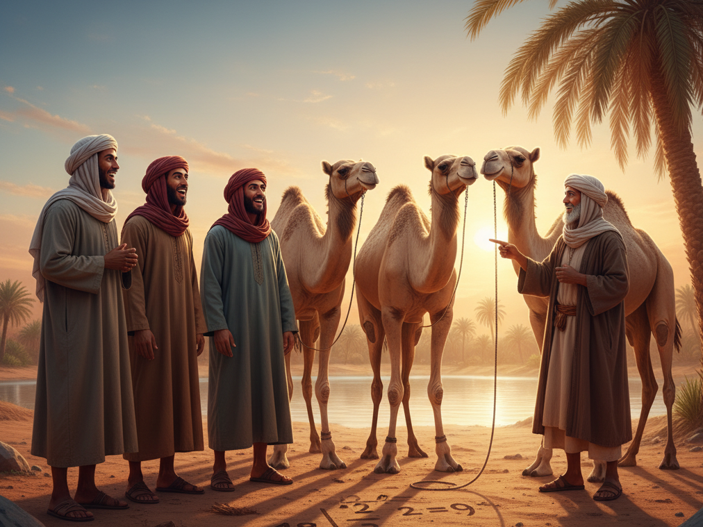 Early the following morning, the traveller told them, “Here, take my camel, but keep him separate. You now have eighteen camels. Ali, that means you get nine camels (1/2 of 18). Omar, you get six camels (1/3 of 18). Ahsan, you get two camels (1/9 of 18). Now, each of you take your allotted quantity.” They did so and were surprised to find that nine plus six plus two totalled seventeen. They were ecstatically overjoyed, returned the visitor’s camel, thanked him for helping, and realized just how wise their father was.